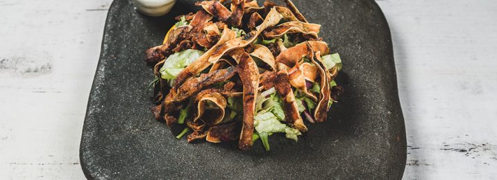 Hrskave svinjske uši sa sezonskom salatom i sweet chili umakom. Crunchy pig ear salad with sweet chili sauce.