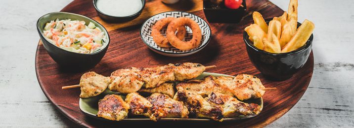 Ražnjići od pilećih prsa sa krumpirom, lepinjom, salatom, ketchup-om i Ranch umakom. Chicken breast kofte with potato, flat bread, salad, ketchup & Ranch sauce.